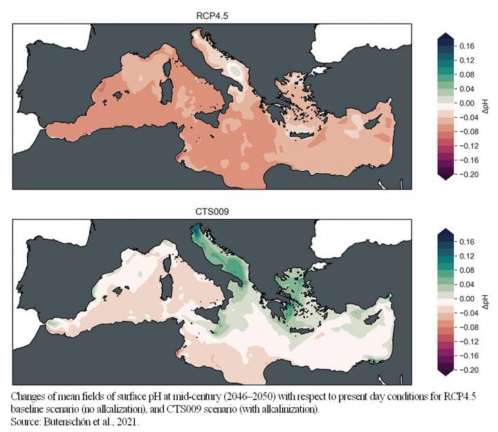 The simulations used in the study suggest the potential of nearly doubling the carbon-dioxide uptake rate of the Mediterranean Sea after 30 years of alkalinization, and of neutralizing the mean surface acidification trend of the baseline scenario without alkalinization over the same time span.