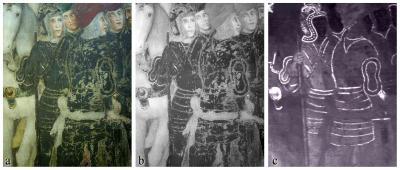 This shows part of the fresco by the Zavattaris in the Theodelindas Chapel. The artworks, executed between 1440 and 1446 are extremely rich and complex, featuring different fresco techniques, gold and silver decorations and reliefs. Color photography (a), and imaging in the NIR (b), compared to the TQR image (c).