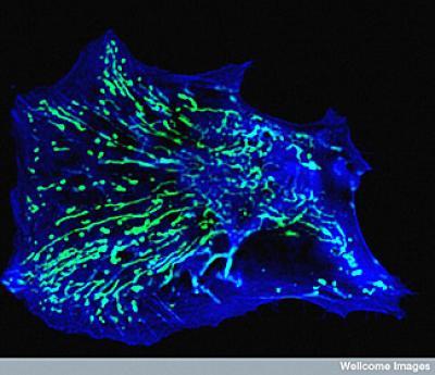 This is a confocal micrograph of a primary human fibroblast cell grown in culture stained blue for actin, a highly abundant protein that makes up the cytoskeleton of cells. Energy-producing mitochondria are shown in green.