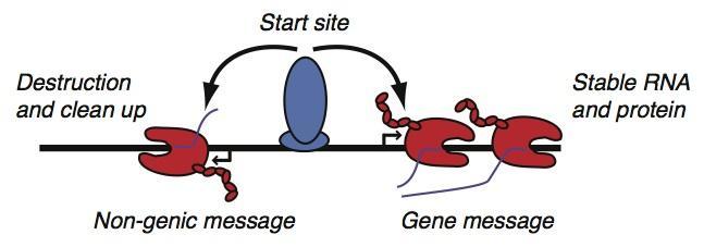 With all these messages, how does the cell know which one encodes the information needed to make a protein? Is there something different about the reading process at genes and regulatory elements that helps avoid confusion? New research, published today in Nature Genetics, has revealed that the initial steps of the reading process itself are actually remarkably similar at both genes and regulatory elements. The main differences seem to occur after this initial step, in the length and stability of the messages. Gene messages are long and stable enough to ensure that genes becomes proteins, whereas regulatory messages are short and unstable, and are rapidly "cleaned up" by the cell.