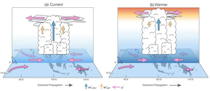 Their analysis reveals that while the Madden-Julian Oscillation's precipitation variations are likely to increase in intensity under a warmer climate, wind variations are likely to increase at a slower rate, or even decrease. That's in contrast to the conventional wisdom of a warming climate producing a more intense Madden-Julian Oscillation, and thus an across-the-board increase in extreme weather.