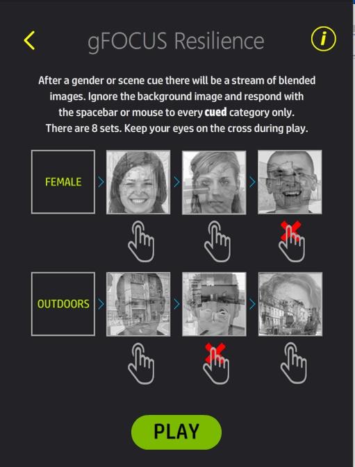 image: The image displays the instructional screen of the gFocus Resilience, which is the version of the game that trains inhibitory control in the context of emotional facial expressions and was the experimental condition in the study. The application was created by IQ Mindware (Mark Ashton Smith, Ph.D.).