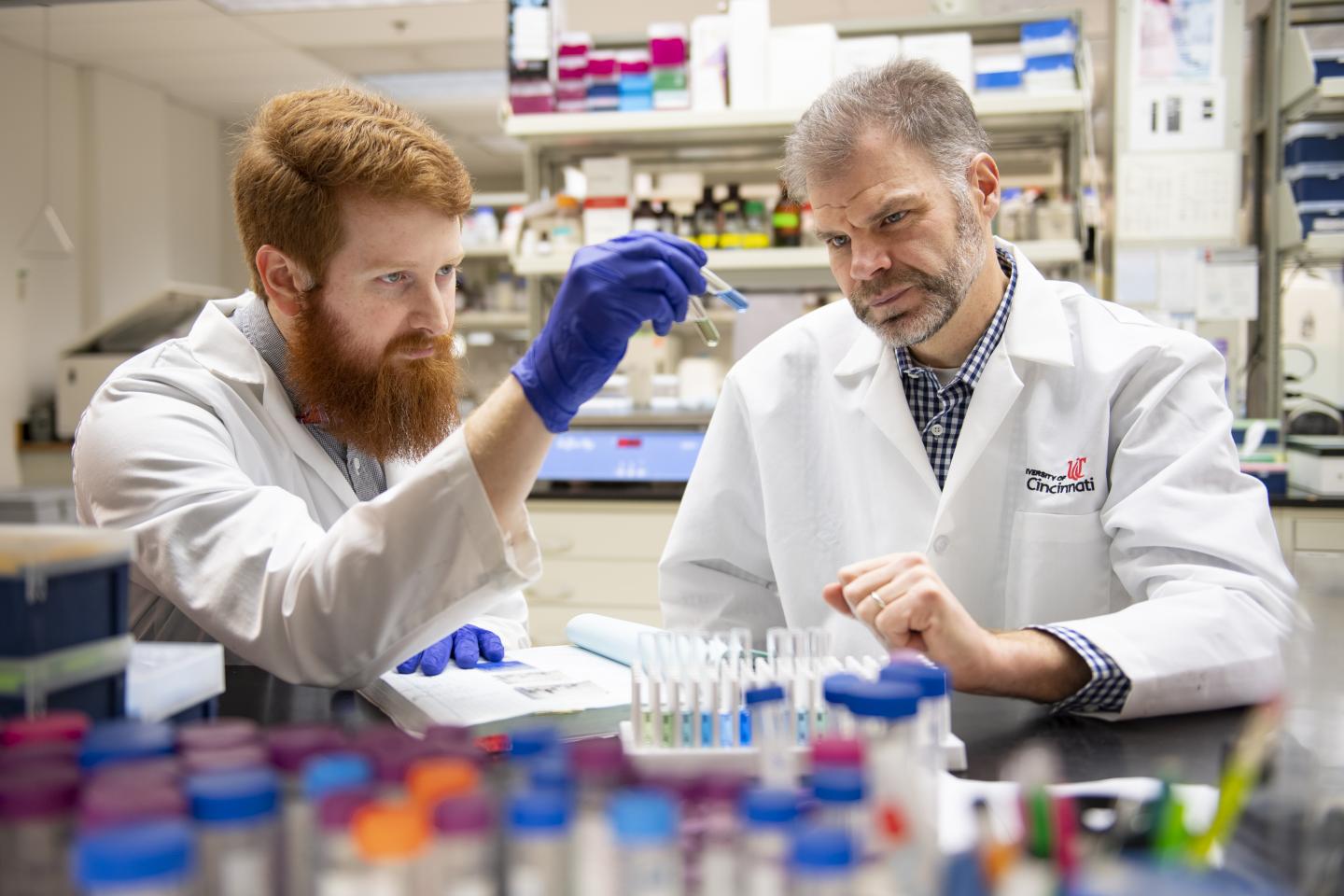 image: Mark Castleberry and Sean Davidson, PhD, shown in a laboratory in the University of Cincinnati College of Medicine.