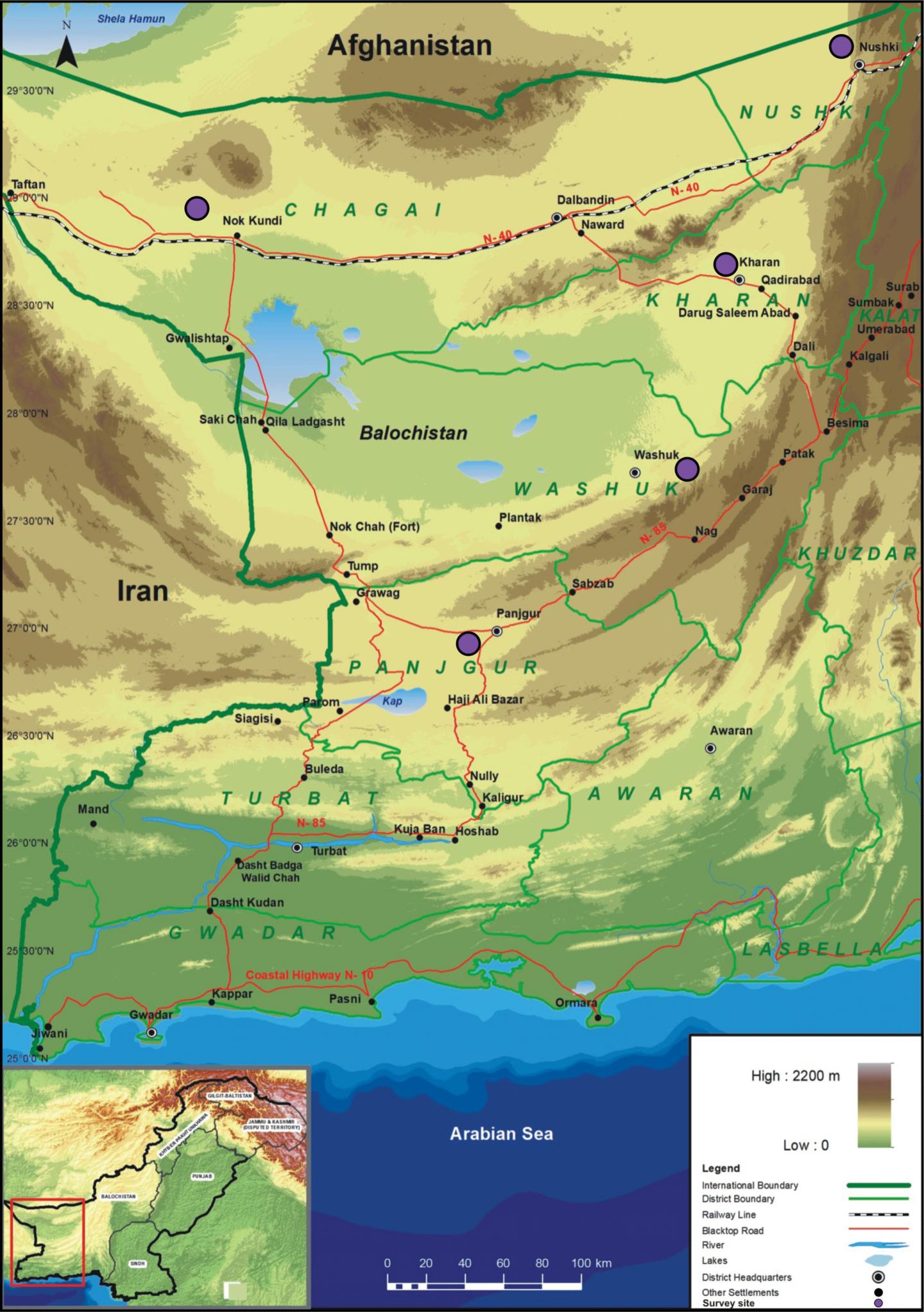 image: A topographic map of southwestern Balochistan showing visit sites in Chagai, Nushki, Panjgur, Kharan and Washuk districts.