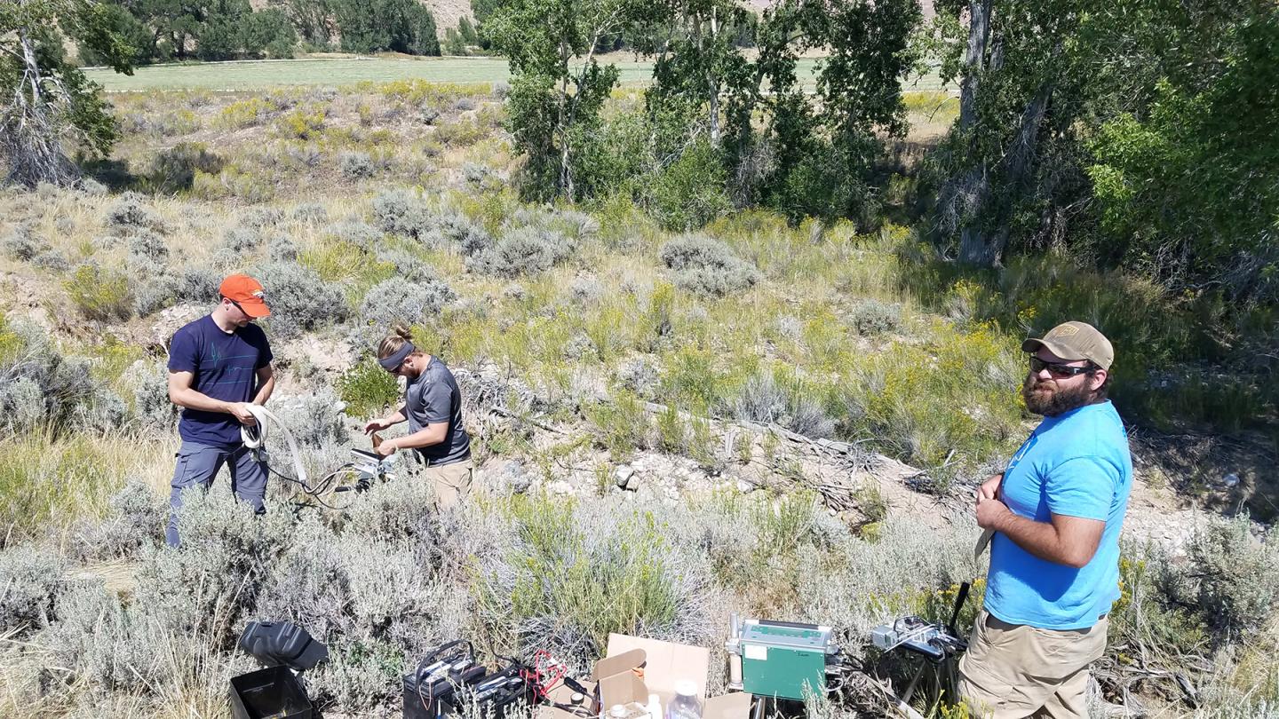 image: University of Wyoming researchers Daniel Beverly, Mario Bretfeld and Adam Nibbelink set up devices in sagebrush at a site 50 miles south of Yellowstone National Park to measure sagebrush response to the total solar eclipse in August 2017.