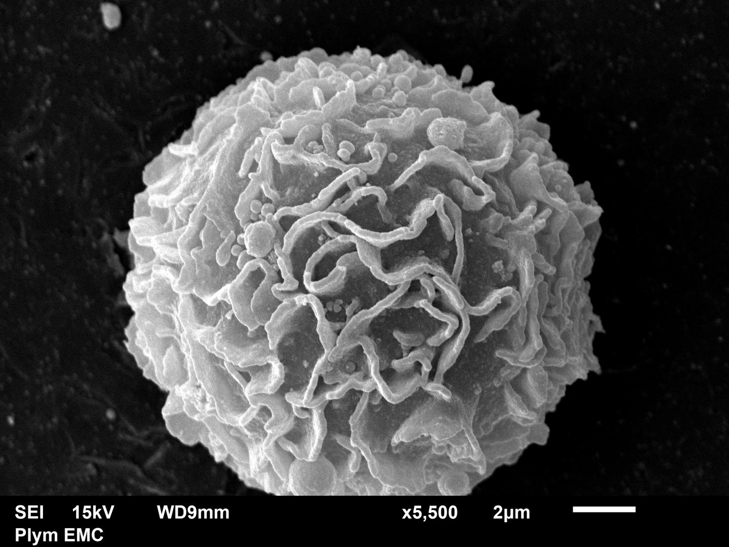 image: A scanning electron microscopy image of a macrophage, total magnification x5500.