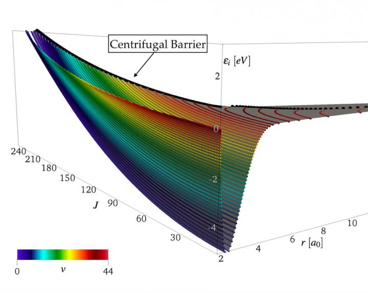 image: In this figure, the rovibrational levels are represented as dots at their inner and outer turning points, and they are colored based on their vibrational quantum numbers.