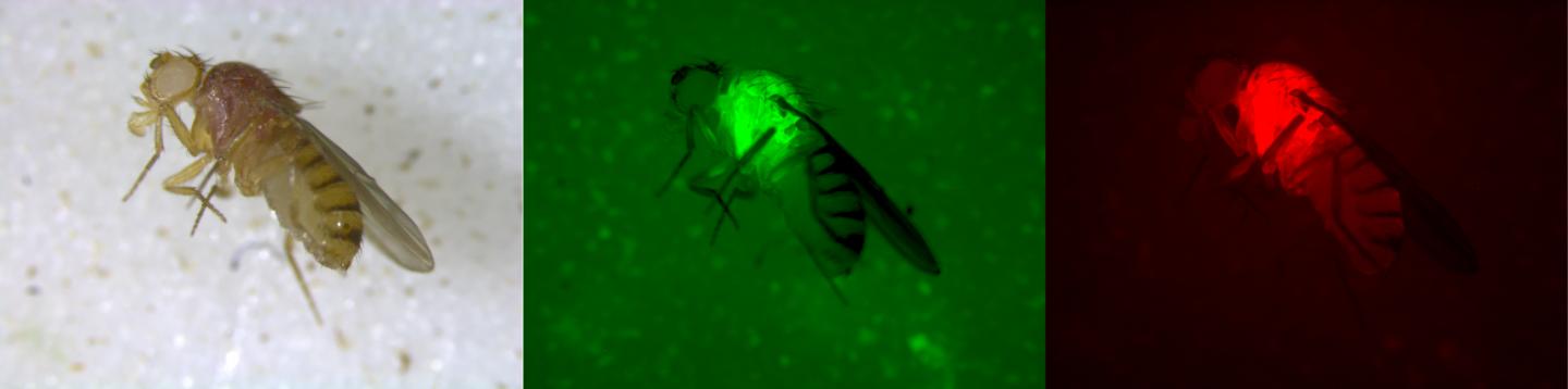 image: Drosophila melanogaster under green and red fluorescence used as a marker to indicate the presence of inserted genes.