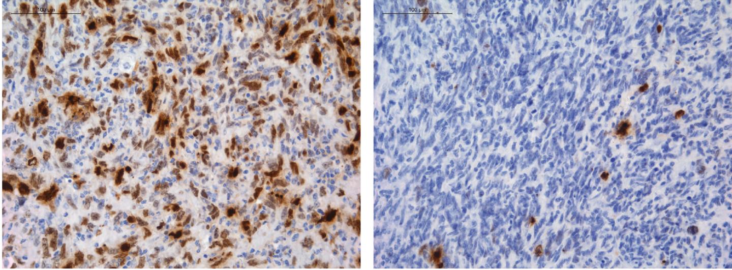 image: Glioma cells (in blue) under temozolomide treatment, with DNA damage marked in brown. When the MGMT locus is intact, MGMT expression is silenced and temozolomide promotes DNA damage all over the tumour cells (left); when the MGMT locus is rearranged, glioma cells overexpress MGMT, can repair the damage and keep growing (right).