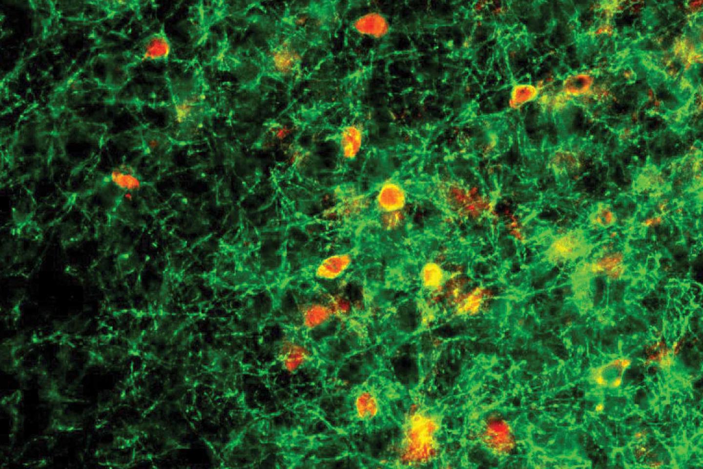 image: Abnormal behavior of parvalbumin (PV) neurons (in red) in the auditory cortex of the mouse brain manifests as parental neglect. Normal activity of PV neurons depends on the Mecp2 gene, without which female mice can't learn to respond to distress cries of young pups.