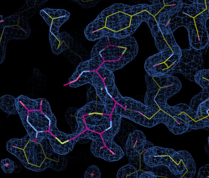 image: This image generated by X-ray crystallography shows a cephalosporin antibiotic, in pink, binding to a protein from the bacterium that causes gonorrhea. The spheres represent water molecules.