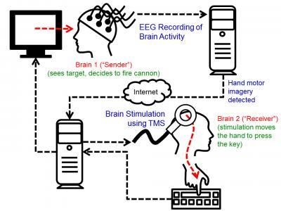 This image shows the cycle of the experiment. Brain signals from the "Sender" are recorded. When the computer detects imagined hand movements, a "fire" command is transmitted over the Internet to the TMS machine, which causes an upward movement of the right hand of the "Receiver." This usually results in the "fire" key being hit.