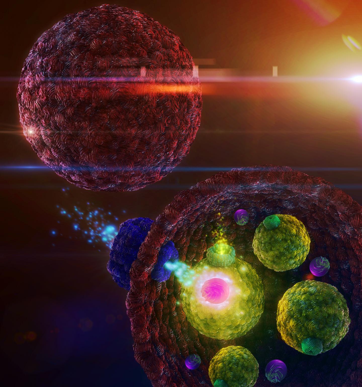 The team created an artificial cell that has smaller cells ('vesicles') inside. The edge of the cell is formed of a membrane that contains pores, which allow calcium ions to enter. Inside the cell, the calcium ions activate enzymes that cause the vesicles to release particles that fluoresce.