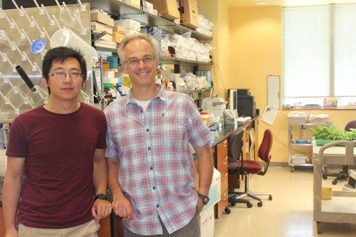 image: Recent doctoral graduate Chenming Cui (left) and David Haak (right), an assistant professor in the School of Plant and Environmental Sciences in the College of Agriculture and Life Sciences, in the lab.