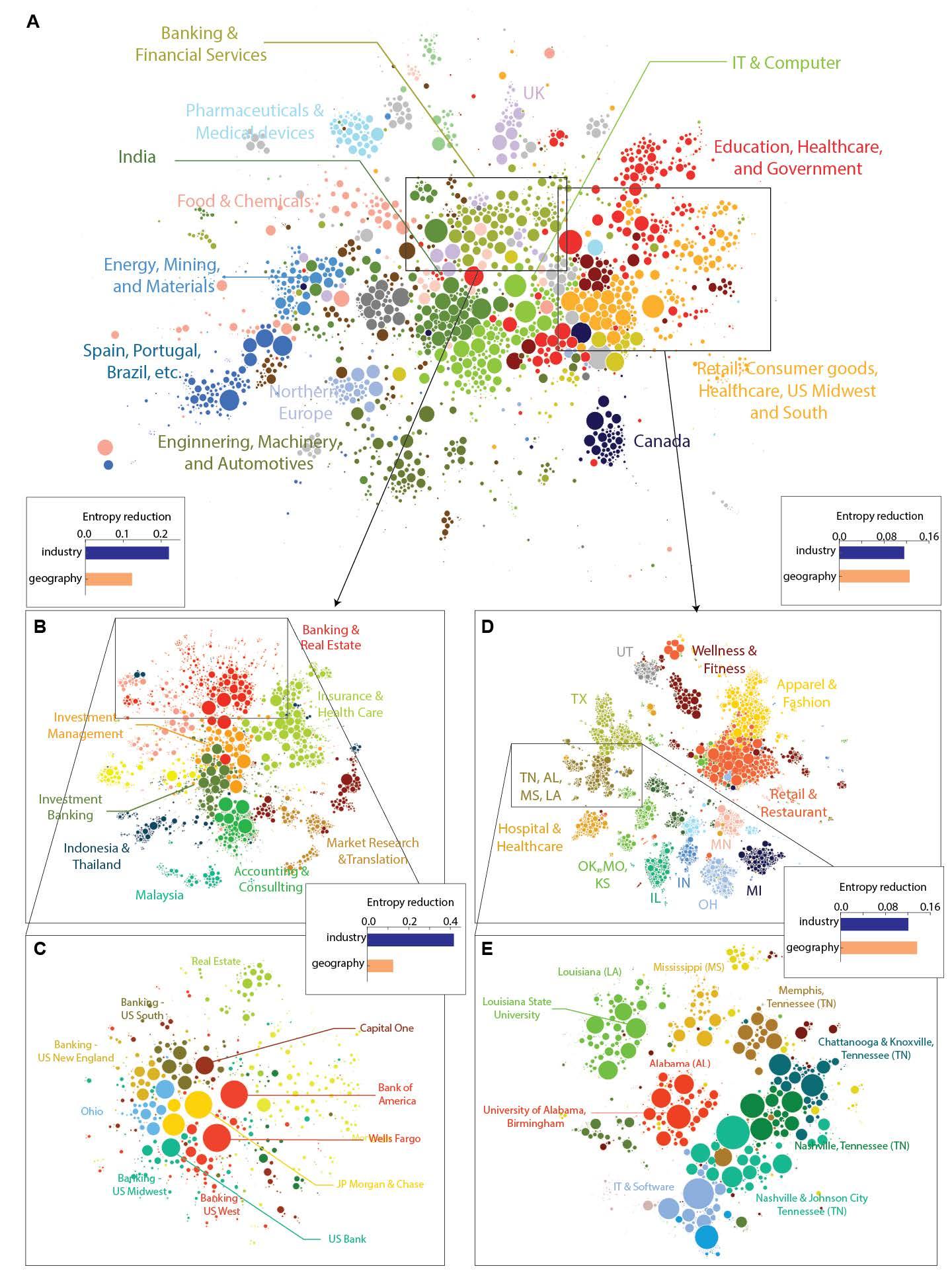 image: The study revealed large-scale associations between industries and people across the globe. Each circle represents a specific geo-industrial cluster with its size proportional to its number of employees.