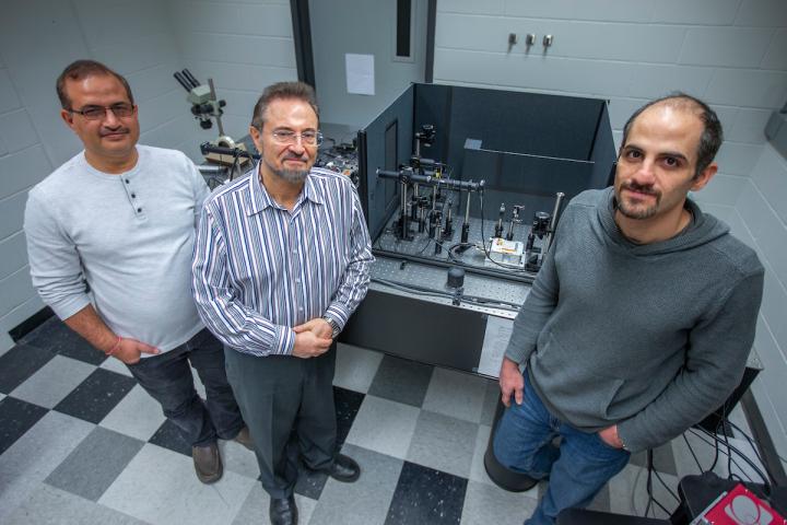 image: Krishan Kumar Pandey, Valery Levitas and Mehdi Kamrani, left to right, study materials subject to high pressures in Levitas' Iowa State University laboratory.