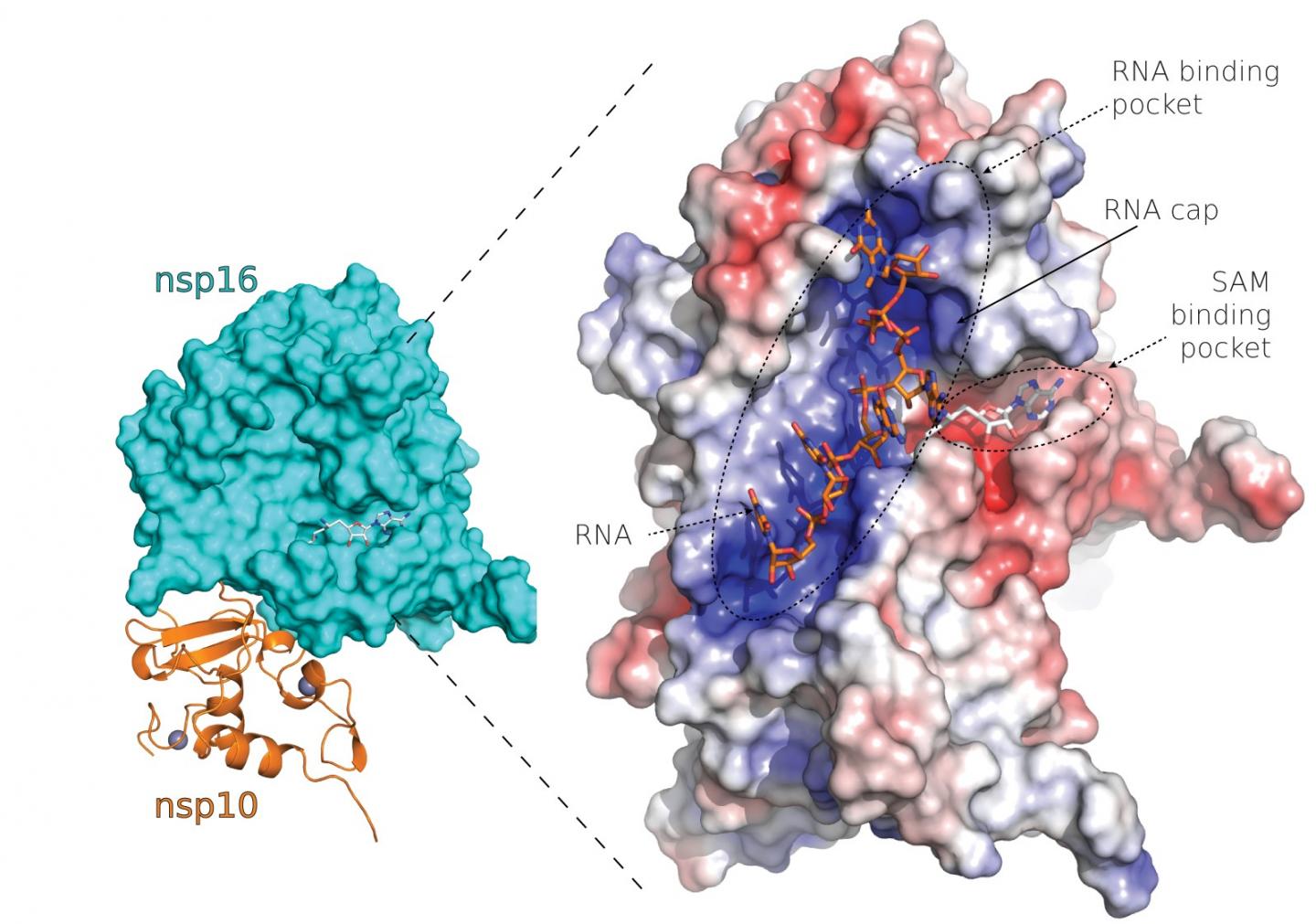 This allowed the researchers to identify several fundamental characteristics of the Nsp16 and Nsp10 protein complex, namely a deep canyon on the surface of the protein complex where binding of the viral RNA occurs and a cap is installed. This canyon can be targeted by inhibitors that suppress the activity of the Nsp16 and Nsp10 protein complex and thus of the entire cap installation process and may, in the future, serve as drugs to combat many coronaviruses.