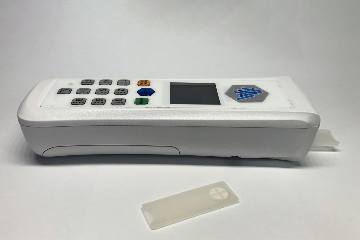 image: A prototype of the handheld ammonia blood detector and associated test strips, developed by researchers at Stanford.