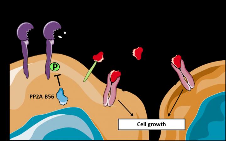image: The researchers' illustration of PP2A binding to ADAM17 whcich cleaves other proteins such as the growth factor EGF which again binds the receptor EGFR and stimulates cell growth.