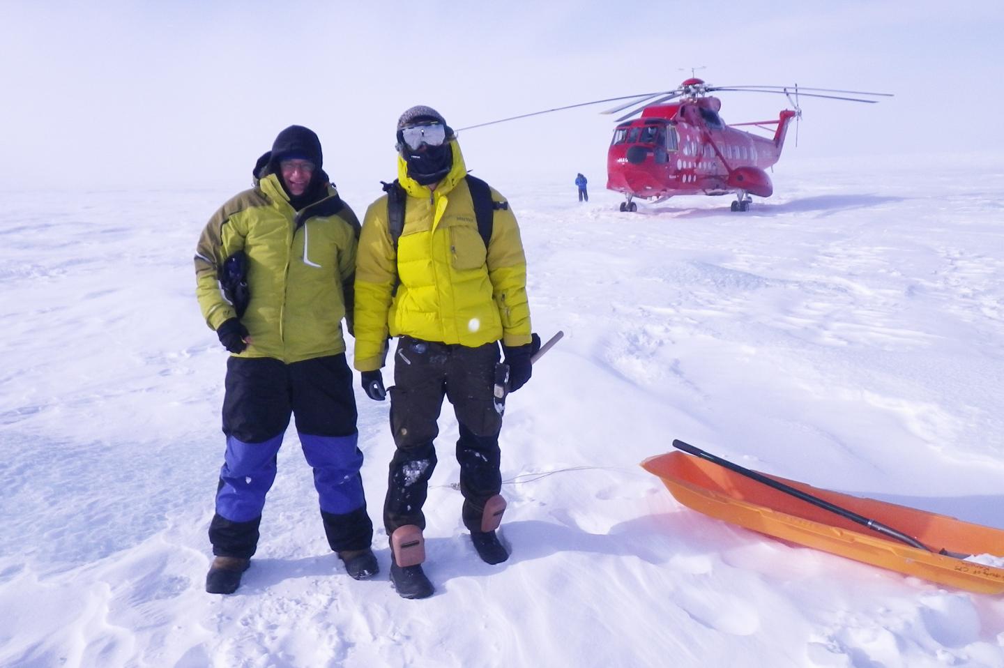 image: Neil Humphrey (left), a University of Wyoming professor of geology and geophysics, and Nathan Maier, a UW geology Ph.D. student, pose on the Greenland Ice Sheet during 2017 field research.