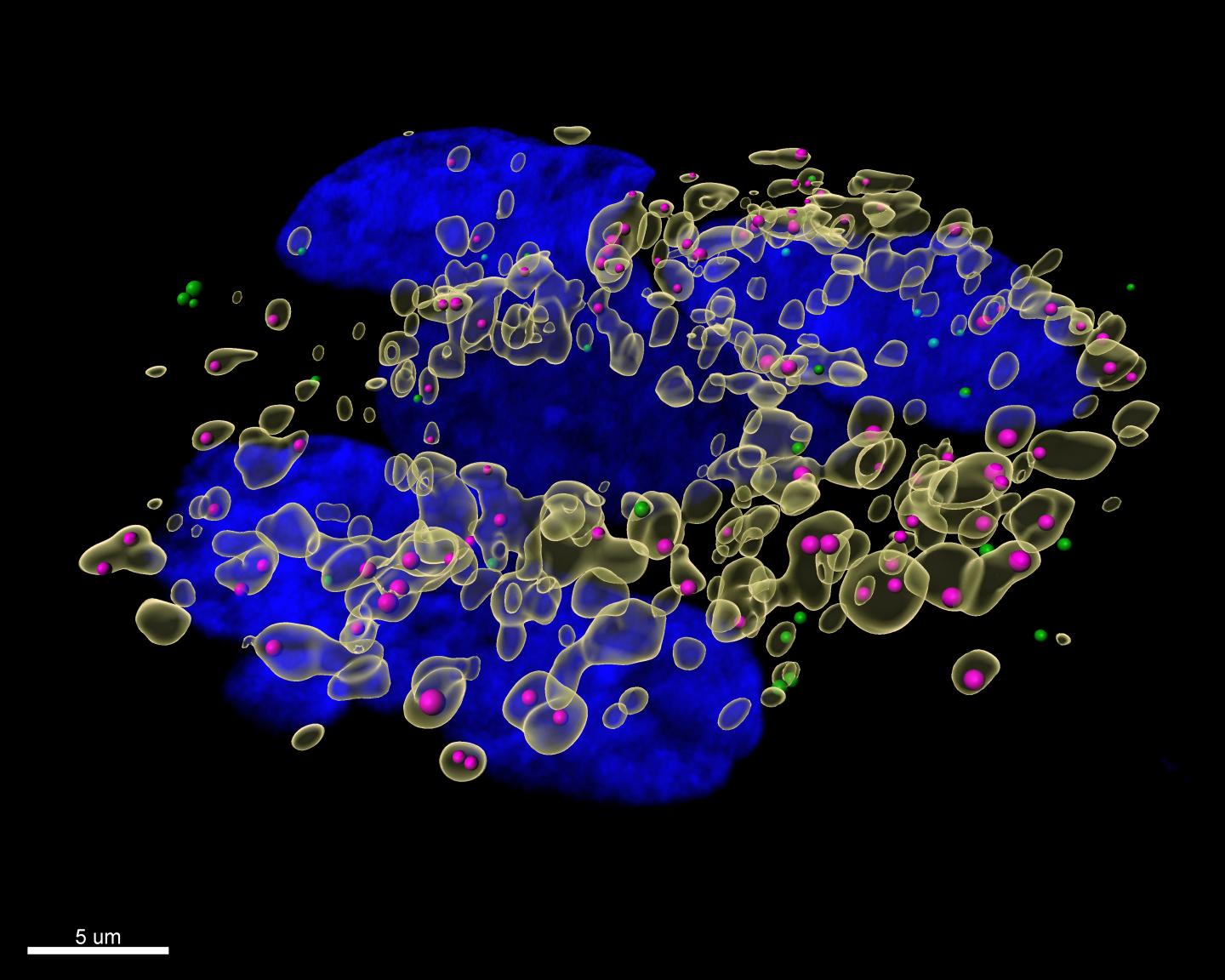 image: Hepatitus A virus particles (pink) trapped in lysosomes (yellow intracellular organelles), unable to initiate replication in the cytoplasm of cells due to UCGC enzyme being knocked out.