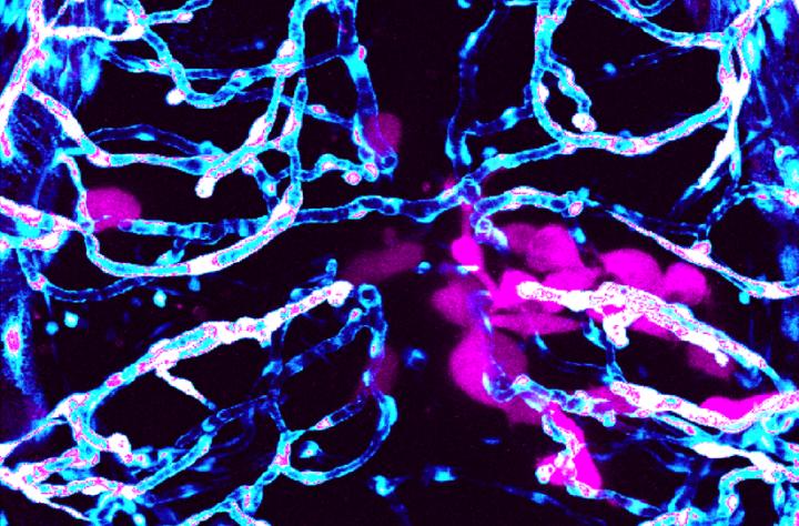 image: A new proof-of-concept study led by Fralin Biomedical Research Institute at VTC neuroscientists shows that zebrafish are suitable models for human glioblastoma research. This confocal microscope image shows the interaction between the brain cancer cells, tagged in pink, and blood vessels, stained in blue and white, just two days after the human tumor cells were implanted in the fish.