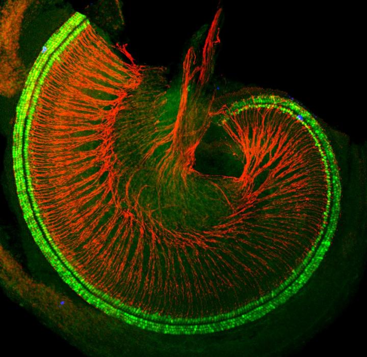 image:Â Mouse cochlea with hair cells shown in green and auditory nerves shown in red.