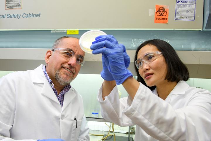 image: Phuc Ha and Haluk Beyenal examine a bacterial culture in the laboratory.
