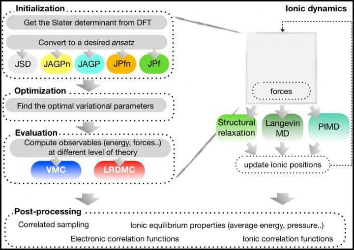 image: Schematic figure of the TurboRVB workflow [K. Nakano et al. J. Chem. Phys. 152, 204121 (2020)]. The code implements flexible many-body wave function ansatz, such as JSD: Jastrow Slater, JAGP: Jastrow Geminal, and JPf: Jastrow Pfaffian. One can prepare a trial wave function using a build-in density functional theory (DFT) code and perform subsequent first-principles variational quantum Monte Carlo (VMC) and lattice discretized diffusion quantum Monte Carlo (LRDMC) calculations. Since forces acting on atoms can be computed, structural optimizations and molecular dynamics simulations are also feasible in TurboRVB.