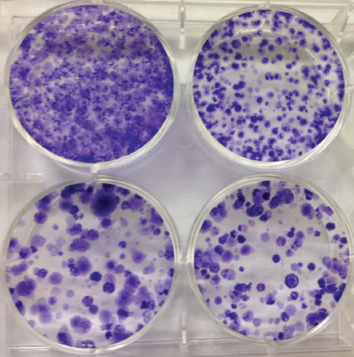 image: Compared with a control (top left), removal of βcatenin (top right) or Importin-11 (bottom left and bottom right) reduces the growth of colorectal cancer cells carrying a mutation in APC.