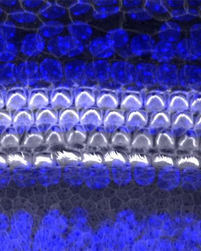 image: A surface view of the organ of hearing (cochlea) from a mouse, using confocal microscopy. The sensory cells are named hair cells because of their apical projections (stereocilia) which move from stimulation by sound.