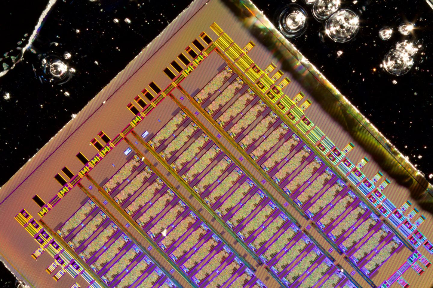 image: Photograph of the bulk silicon electronic-photonic chip designed by the MIT, UC Berkeley and Boston University team.