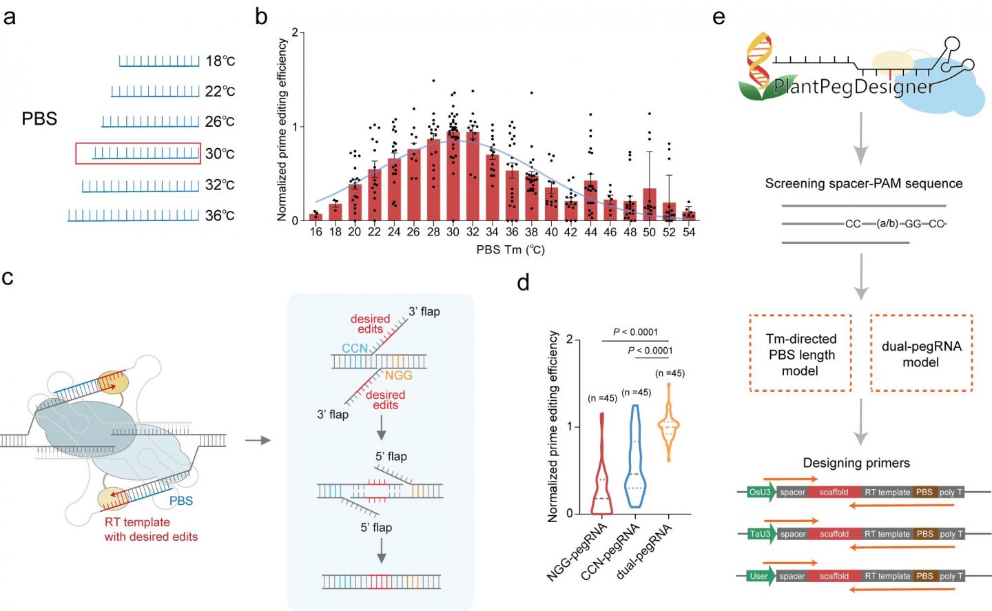 Since the hybridization of the primer binding site (PBS) with the non-target strand ssDNA is the initial step in reverse transcription, the researchers hypothesized that the melting temperature (Tm) of the PBS sequence (referred to hereafter as PBS Tm) is an important parameter for prime editors. By analyzing prime editing efficiencies at 18 endogenous target sites in rice protoplasts, they found that PBS Tm strongly affects editing efficiency, with maximal prime editing occurring when PBS Tm is 30 °C in rice.