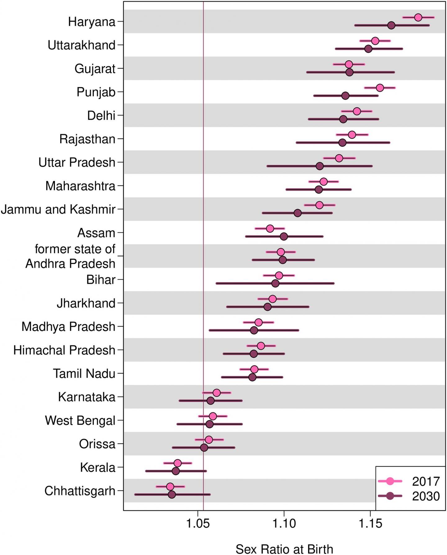 In the new study, researchers projected the SRB in the largest 29 Indian States and Union Territories (UTs), which covered 98.4% of the total population of India as of the year 2011.