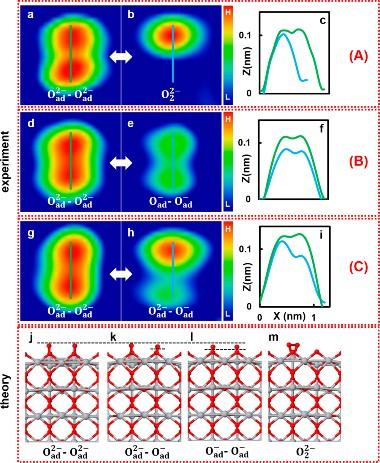 image: (a−c) AFM images before (a) and after (b) KPFS manipulation of Oad2−−Oad2− with the tip positioned symmetrically in the middle and the corresponding line profiles (c). The double bright spot became a single one, indicating formation of an oxygen molecular species, O22−. (d−f) AFM images before (d) and after (e) KPFS manipulation of Oad2−−Oad2− with the tip positioned slightly off the middle position between the two atoms and the corresponding line profiles (f). (g−i) AFM images before (g) and after (h) KPFS manipulation of Oad2−−Oad2− with the tip positioned above one oxygen atom and the corresponding line profiles (i), indicating a change in the charge state from Oad2− to Oad − of only the oxygen atom that is under the tip. (j−m) DFT optimized structures are shown in each case: (j) Oad2−−Oad2−; (k) Oad2−−Oad−; (l) Oad−−Oad−; and (m) O22− adsorbed at the on-top Ti5c site. Note that there is also another adsorption site, the bridge site, see SI, section S9. Dashed horizontal lines depict the differences in heights of the oxygen adatoms. (A), (B), and (C) denote the three key manipulation scenarios, see text.