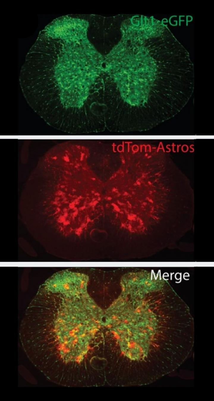 To figure out how the brain decides which cells need the glutamate transporters, Rothstein and colleagues focused on the region of DNA in front of the gene that typically controls the on-off switch needed to manufacture the protein. They genetically engineered mice to glow red in every cell where the gene is activated.