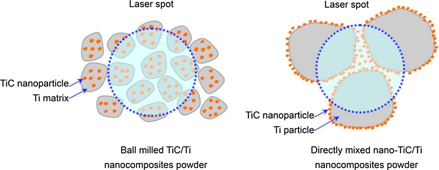 image: Schematic of nanoparticle distribution in TiC/Ti nanocomposite powders produced by ball milling and direct mixing, prepared for SLM.