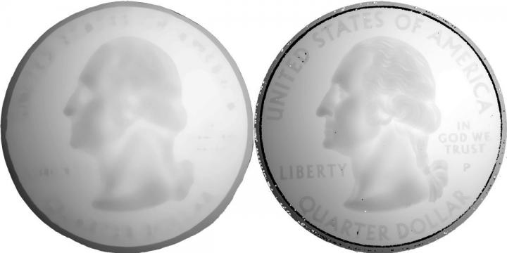 image: A research team led by Carnegie Mellon University scientists has demonstrated techniques for using scattered light to see around corners, enabling them to reconstruct images in detail. On the left is a reconstructed image of a US quarter that was scanned using non-line-of-sight methods, compared with the quarter on the right that was scanned using standard methods.