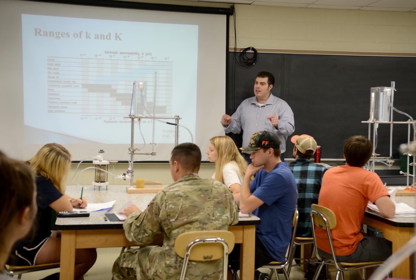 image: In this April 2019 photo, Assistant Professor Ryan Pollyea (standing) teaches undergraduate students about permeability in the lab section of Groundwater Hydrology (GEOS 4804).
