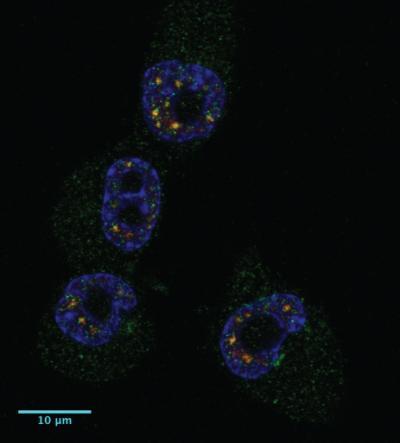 Green shows the localization of CPEB1 in four tumor cells and blue the nuclei.
