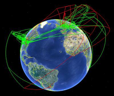 Associate Professor Daniel Janies, Ph.D., an expert in computational genomics at the Wexner Medical Center at The Ohio State University, is working with software engineers at the Ohio Supercomputer Center to expand the reach of SUPRAMAP, a web-based application that synthesizes large, diverse datasets and displays them in geospatial browsers. This is a screenshot of the spread of H7 influenza as produced by SUPRAMAP and visualized by Google Earth. This view illustrates the historical spread of high pathogenic lineages (high-altitude red lines) and the recent local evolution of high pathogenicity (low-altitude red lines).