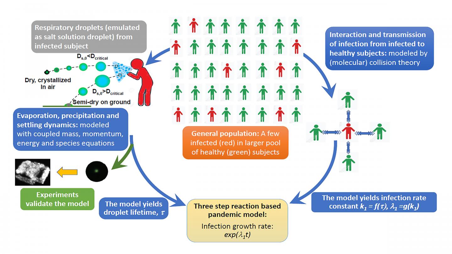 The researchers modeled the pandemic dynamics with a reaction mechanism, where each reaction has a rate constant obtained by calculating the frequency of collisions between the infectious droplet cloud ejected by an infected person and a healthy person.