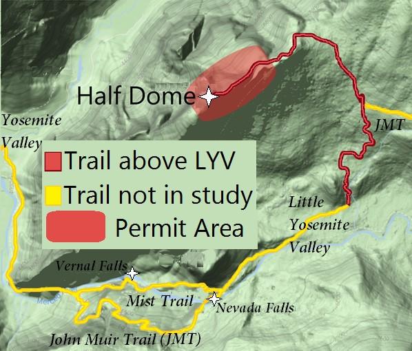 image: Half Dome Trail map. The Half Dome Trail splits midway into the John Muir Trail and Mist Trail, which converge at Nevada Falls to form a single route through Little Yosemite Valley to Half Dome. Permit area is the restricted section including subdome, the cable route, and summit.
