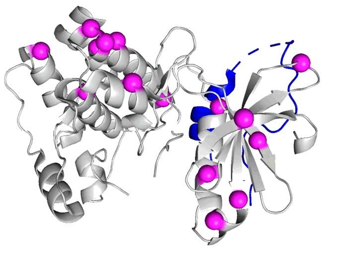image: In this simulation of two ancient proteins, Aurora A (gray) shifts into a new structure when activated by TPX2 (blue). TPX2 relies on the allosteric networks of Aurora A (pink spheres) to twist it into its new shape.