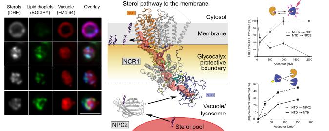image: 1) Live-Cell Imaging of Sterol Transport to the Yeast Vacuole; 2) Eukaryotic sterol membrane integration; 3) Sterol Affinity of NPC2 and NTD and Sterol Transfer Assays