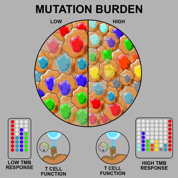 image: In low mutation burden tumors, most mutations are targeted with functional T cell responses. In contrast, high mutation burden tumors have the same overall T cell response magnitude, but it is distributed among a larger mutation landscape, leading to many mutations eliciting small or undetectable responses. This material relates to a paper that appeared in the Jun. 26, 2019, issue of Science Translational Medicine, published by AAAS. The paper, by A.E. Zamora at St. Jude Children's Research Hospital in Memphis, TN; and colleagues was titled, "Pediatric patients with acute lymphoblastic leukemia generate abundant and functional neoantigen-specific CD8+ T cell responses."