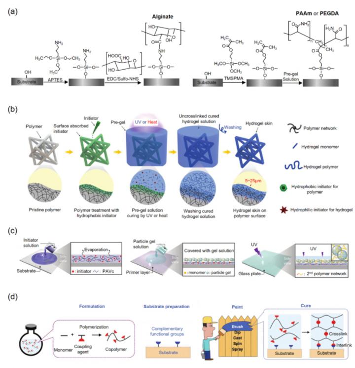 image: (a) The surface bridge method, (b) & (c) the surface initiation method, and (d) the hydrogel paint method.