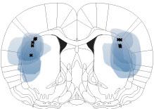 image: An illustration of the dorsolateral striatum shown as a cross-section. The blue shading shows the area of the brain that had the optogenetic receptors, and the black dots show where the placements were for light delivery.