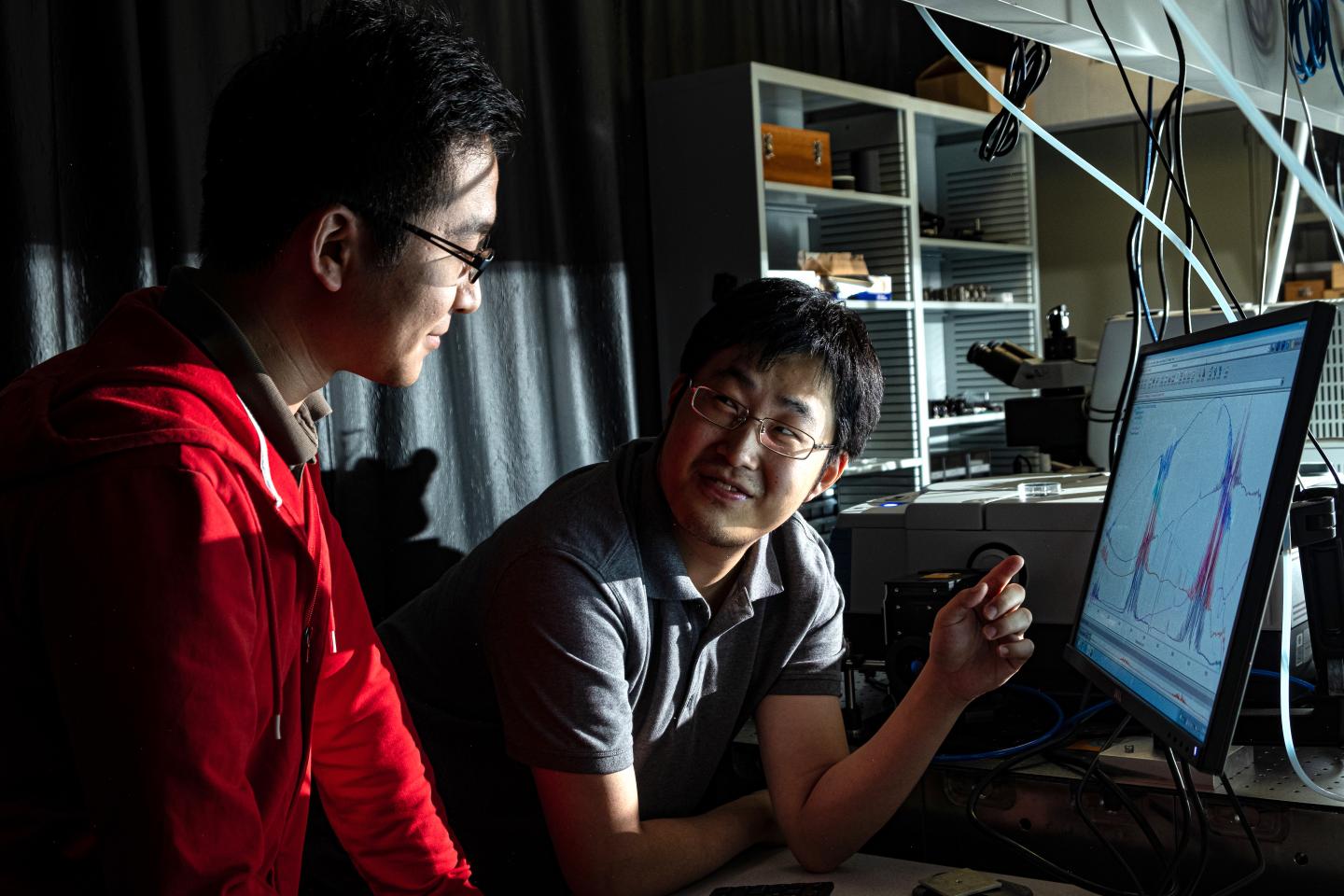 image: Rice University graduate student Xinwei Li, left, and postdoctoral researcher Weilu Gao used carbon nanotube films Gao helped develop to create a device to recycle waste heat. It could ultimately enhance solar cell output and increase the efficiency of industrial waste-heat recovery.