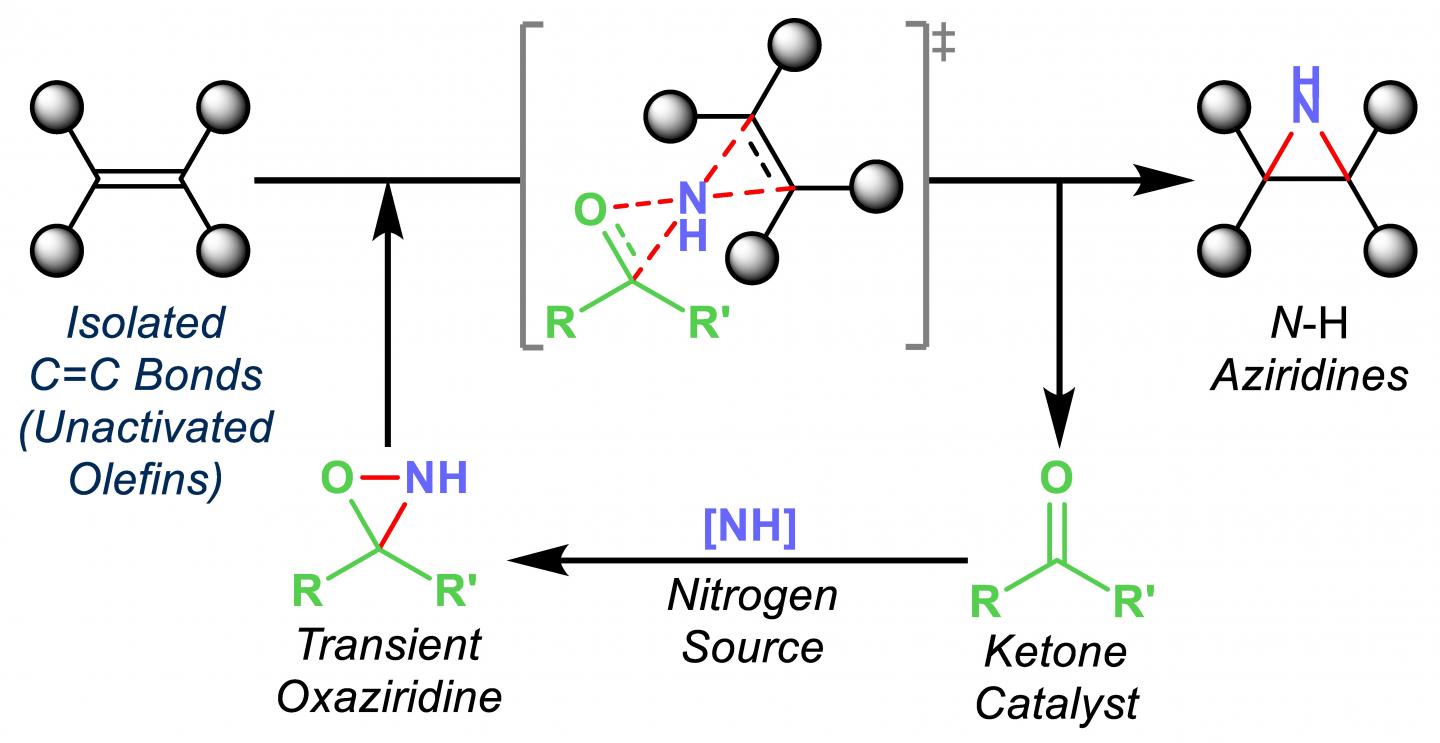 image: A Rice University method to produce aziridines, building blocks in drug design, makes the process far less expensive and more environmentally friendly than current methods that use metal catalysts.